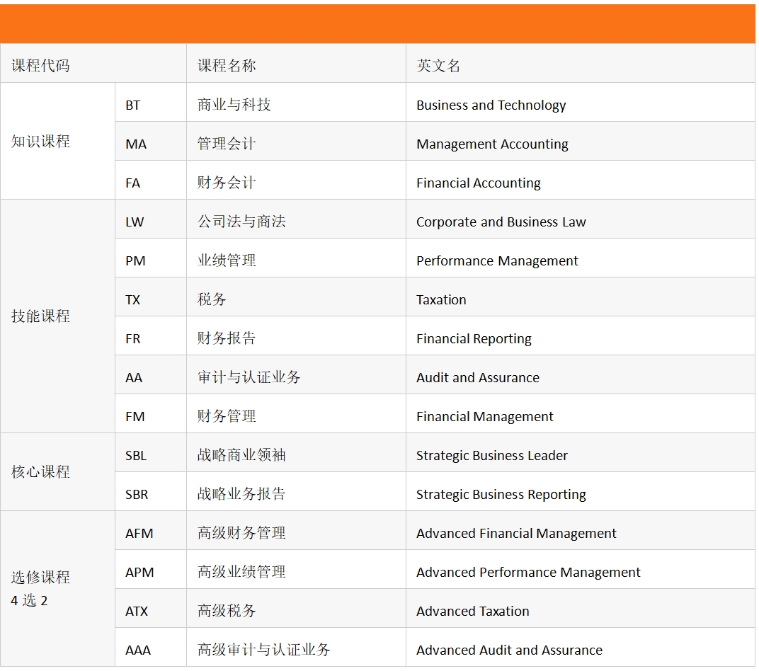 acca一共有15门考试科目,分为知识课程、技能课程、核心课程、选修课程四个部分,选修课程4选2,考生只需要考完13科即可。具体科目如下: