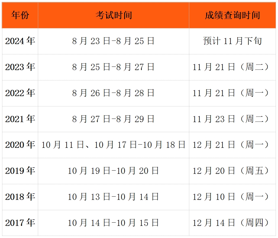 去年的CPA考试时间比今年晚了两天,出成绩时间是11月21日(星期二)。今年的CPA考试评卷速度如果与去年保持一致的话,那么成绩也将于11月21日前后公布,大家可以蹲一下。以下是历年的CPA考试时间与成绩公布时间,大家可以作为参考: